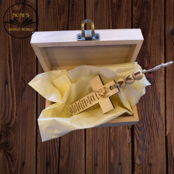 Liebevoll gravierte Holzbox mit Schutzengel-Motiv, personalisiert mit Name, Geburtsdatum, Größe und Gewicht. Inklusive Kreuzanhänger mit Gebet. Perfekt als Geschenk zur Geburt oder Taufe – ein unvergessliches Erinnerungsstück.